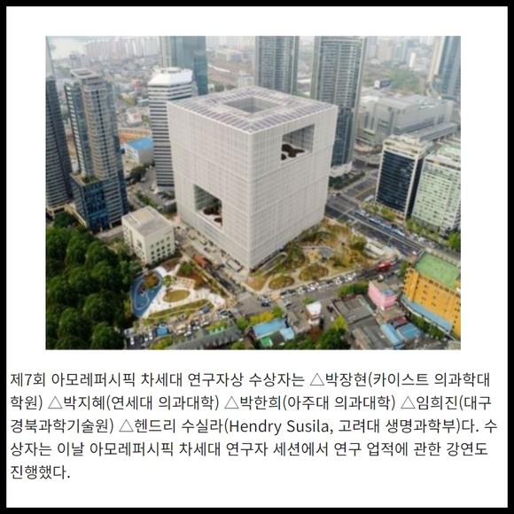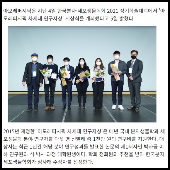 [프라임경제] 아모레퍼시픽은 지난 4일 한국분자·세포생물학회 2021 정기학술대회에서 '아모레퍼시픽 차세대 연구자상' 시상식을 개최했다고 5일 밝혔다.