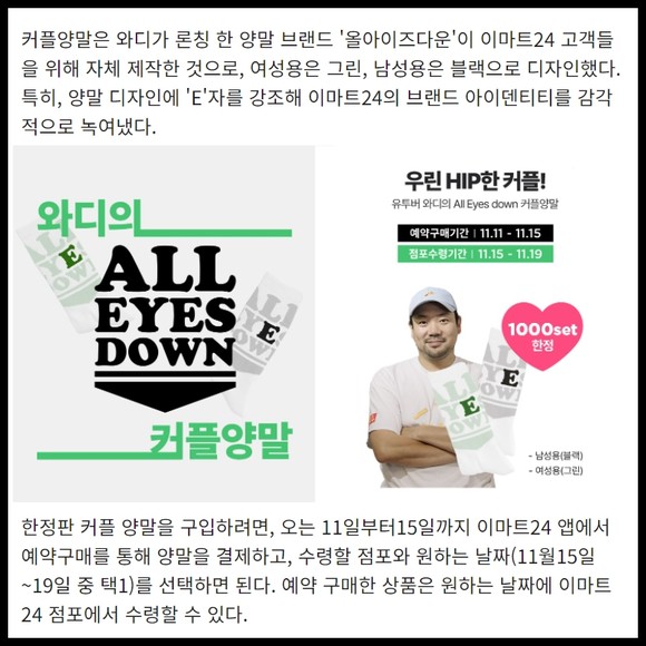 이번 한정판 커플 양말은 '커플'을 콘셉트로 한 이마트24의 빼빼로데이 마케팅의 일환으로, 패션에 관심이 많은 MZ세대 고객들에게 차별화된 경험을 선사하기 위해 기획됐다.