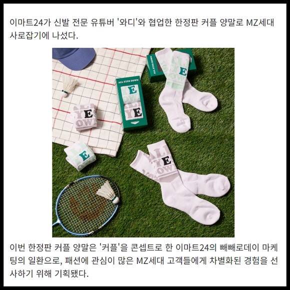 [프라임경제] 이마트24가 신발 전문 유튜버 '와디'와 협업한 한정판 커플 양말로 MZ세대 사로잡기에 나섰다.