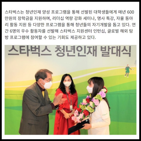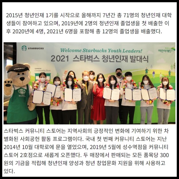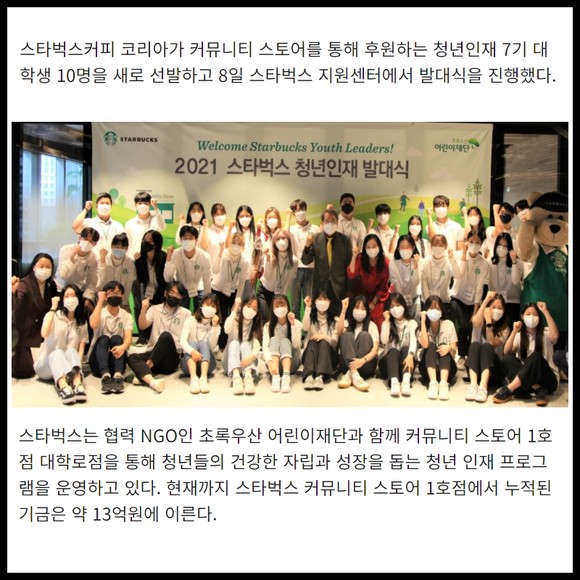 스타벅스는 협력 NGO인 초록우산 어린이재단과 함께 커뮤니티 스토어 1호점 대학로점을 통해 청년들의 건강한 자립과 성장을 돕는 청년 인재 프로그램을 운영하고 있다. 현재까지 스타벅스 커뮤니티 스토어 1호점에서 누적된 기금은 약 13억원에 이른다.