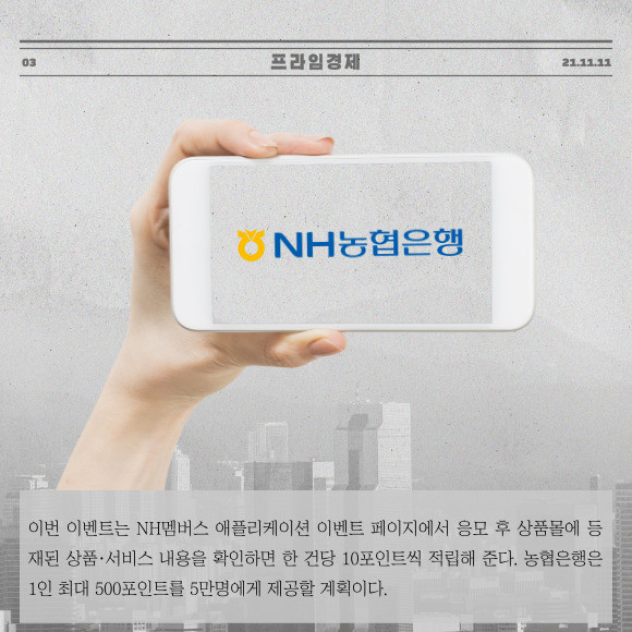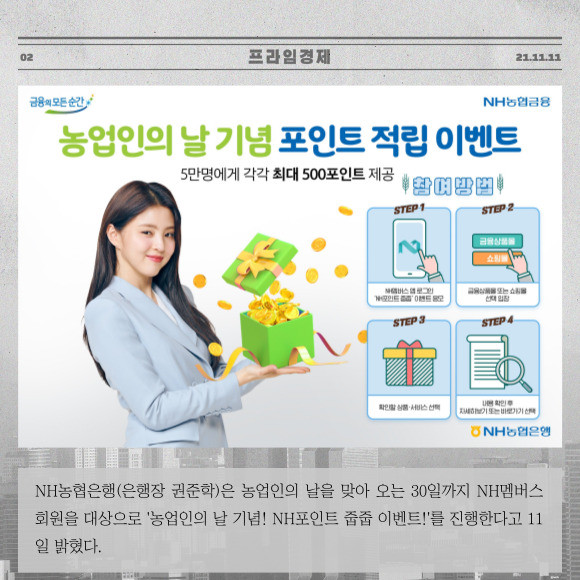 [프라임경제] NH농협은행(은행장 권준학)은 농업인의 날을 맞아 오는 30일까지 NH멤버스 회원을 대상으로 '농업인의 날 기념! NH포인트 줍줍 이벤트!'를 진행한다고 11일 밝혔다.