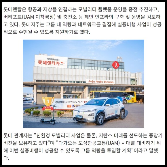 [프라임경제] 롯데가 도심항공교통(UAM) 사업에 진출해 통합 모빌리티 플랫폼을 구축한다. 롯데렌탈 등 지상 기반 네트워크와 항공을 연결해 차별화된 교통서비스 제공이 목표다.