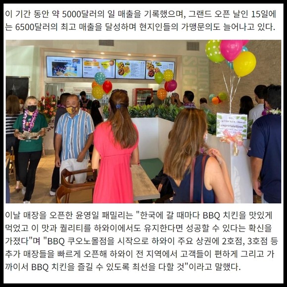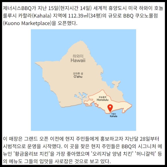 [프라임경제] 제너시스BBQ(회장 윤홍근)가 지난 15일(현지시간 14일) 세계적 휴양도시 미국 하와이 호놀룰루시 카할라(Kahala) 지역에 112.39㎡(34평)의 규모로 BBQ 쿠오노몰점(Kuono Marketplace)을 오픈했다.