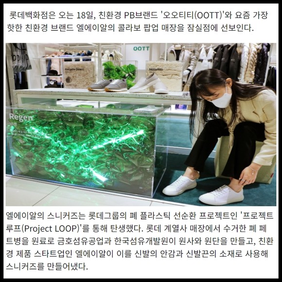 롯데백화점은 오는 18일, 친환경 PB브랜드 '오오티티(OOTT)'와 요즘 가장 핫한 친환경 브랜드 엘에이알의 콜라보 팝업 매장을 잠실점에 선보인다.