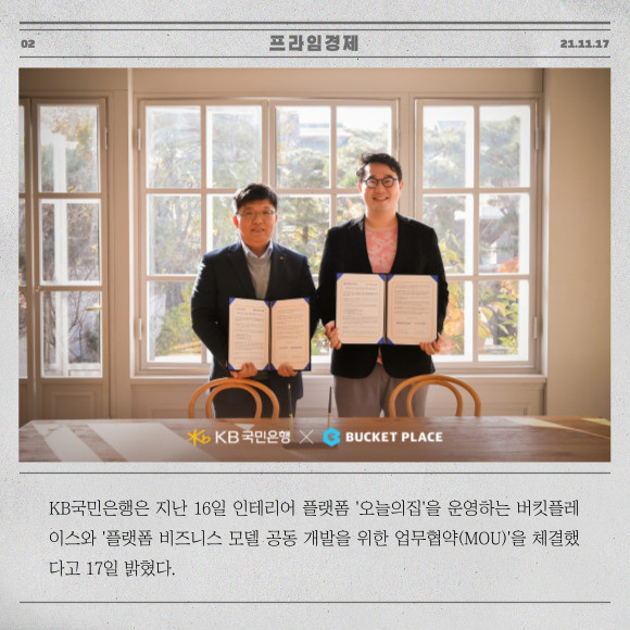 [프라임경제] KB국민은행은 지난 16일 인테리어 플랫폼 '오늘의집'을 운영하는 버킷플레이스와 '플랫폼 비즈니스 모델 공동 개발을 위한 업무협약(MOU)'을 체결했다고 17일 밝혔다.