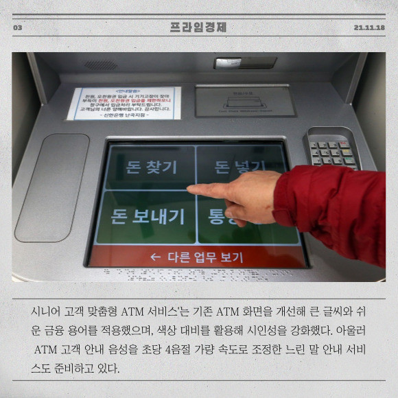 [프라임경제] 신한은행(은행장 진옥동)은 고령층 고객의 디지털 금융 접근성을 높이고자 '시니어 고객 맞춤형 ATM 서비스'를 출시했다고 18일 밝혔다.