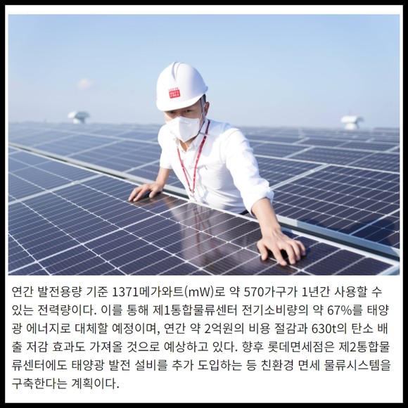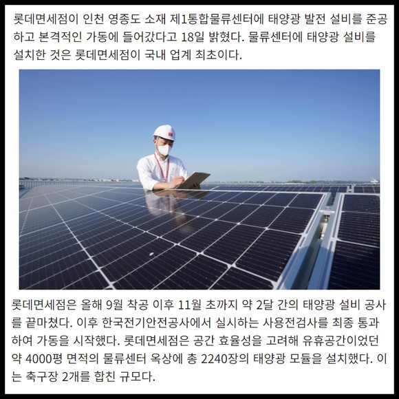 [프라임경제] 롯데면세점이 인천 영종도 소재 제1통합물류센터에 태양광 발전 설비를 준공하고 본격적인 가동에 들어갔다고 18일 밝혔다. 물류센터에 태양광 설비를 설치한 것은 롯데면세점이 국내 업계 최초이다.