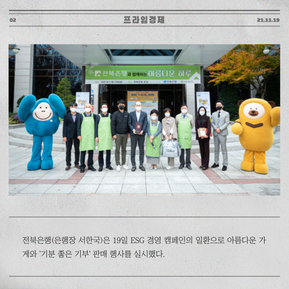 [프라임경제] 전북은행(은행장 서한국)은 19일 ESG 경영 캠페인의 일환으로 아름다운 가게와 '기분 좋은 기부' 판매 행사를 실시했다.