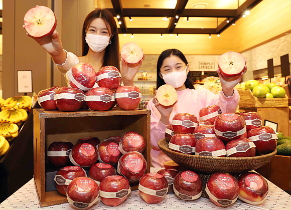 겉은 사과 모양이지만 속은 복숭아처럼 붉은 빛깔의 '복숭아 사과(Peach Apple)'를 백화점 업계 최초로 선보이는 것이다.