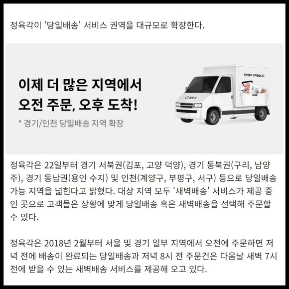 정육각은 22일부터 경기 서북권(김포, 고양 덕양), 경기 동북권(구리, 남양주), 경기 동남권(용인 수지) 및 인천(계양구, 부평구, 서구) 등으로 당일배송 가능 지역을 넓힌다고 밝혔다. 대상 지역 모두 '새벽배송' 서비스가 제공 중인 곳으로 고객들은 상황에 맞게 당일배송 혹은 새벽배송을 선택해 주문할 수 있다.
