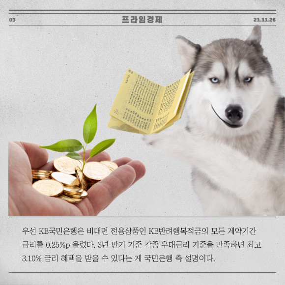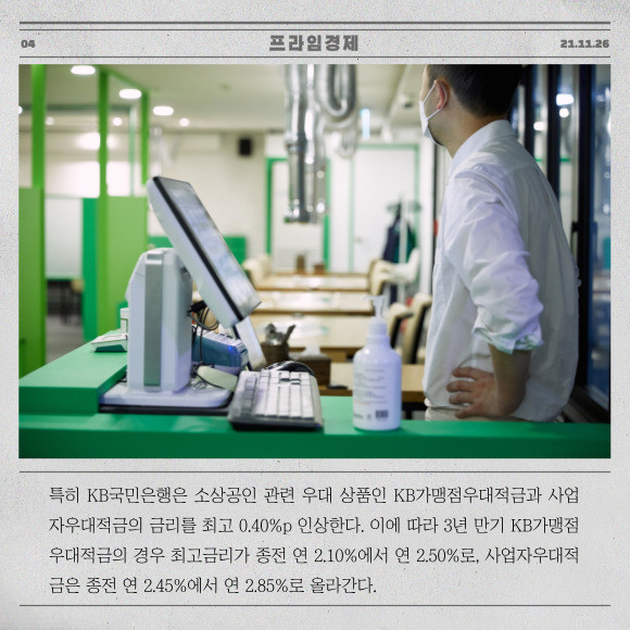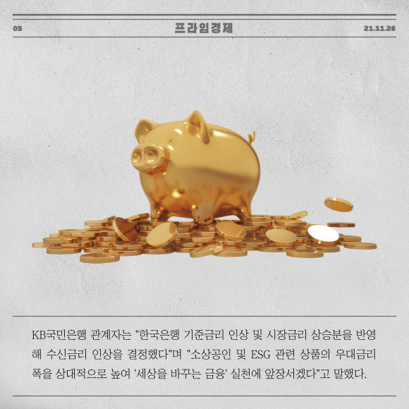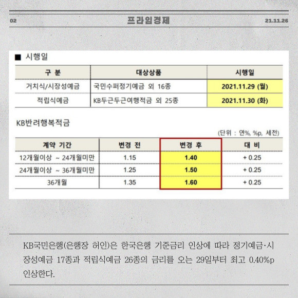 [프라임경제] KB국민은행(은행장 허인)은 한국은행 기준금리 인상에 따라 정기예금·시장성예금 17종과 적립식예금 26종의 금리를 오는 29일부터 최고 0.40%p 인상한다.