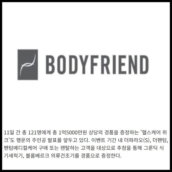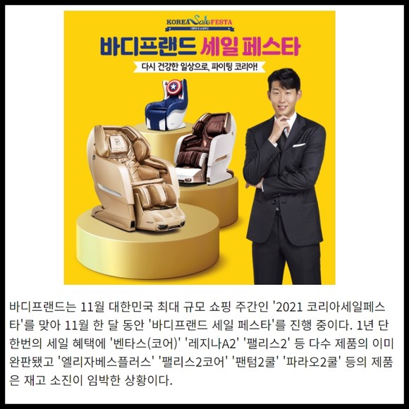 [프라임경제] 바디프랜드는 11월 대한민국 최대 규모 쇼핑 주간인 '2021 코리아세일페스타'를 맞아 11월 한 달 동안 '바디프랜드 세일 페스타'를 진행 중이다.
