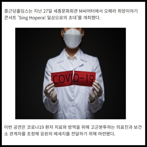 [카드] 종근당홀딩스, 코로나19 방역 종사자 초청 '오페라 희망이야기' 콘서트