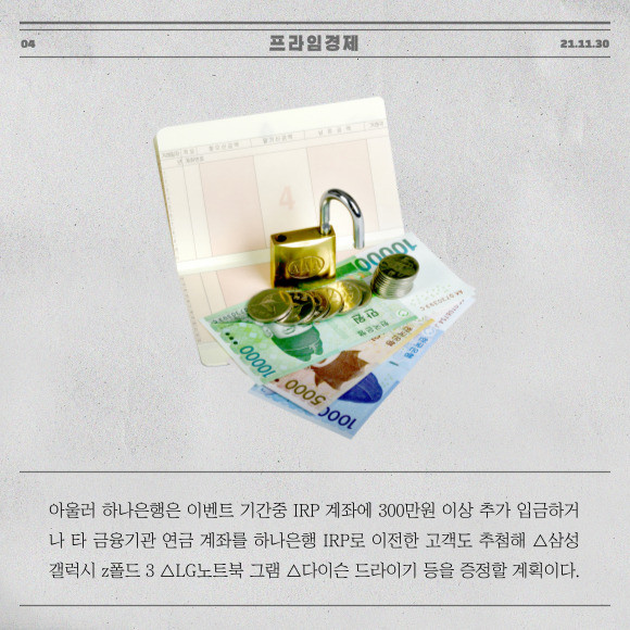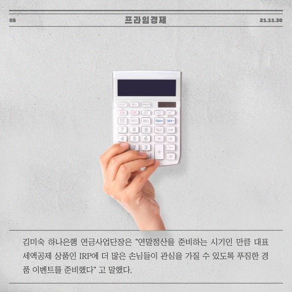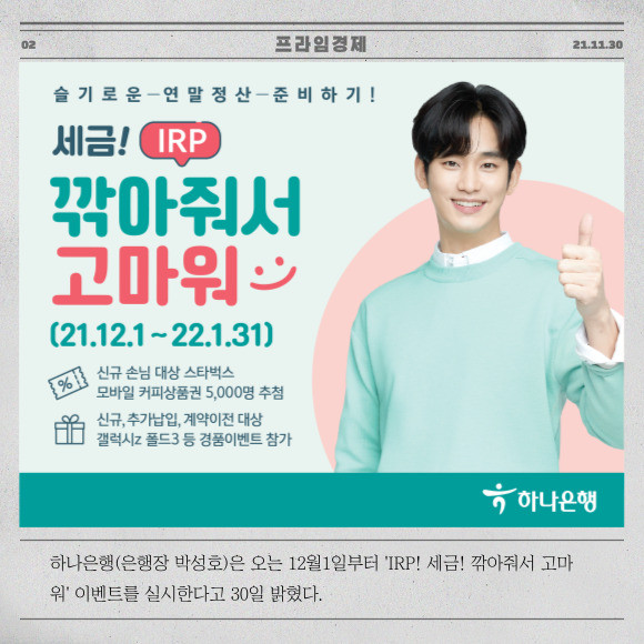 [프라임경제] 하나은행(은행장 박성호)은 오는 12월1일부터 'IRP! 세금! 깎아줘서 고마워' 이벤트를 실시한다고 30일 밝혔다.