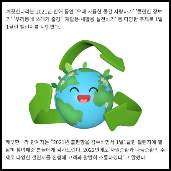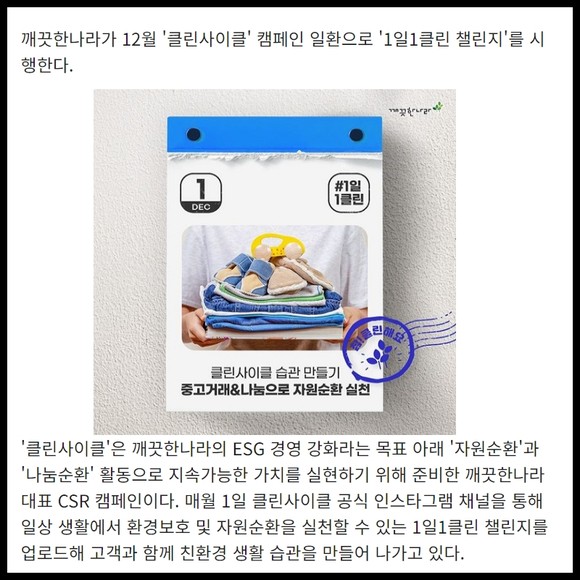 [프라임경제] 깨끗한나라가 12월 '클린사이클' 캠페인 일환으로 '1일1클린 챌린지'를 시행한다.