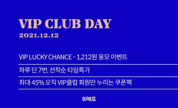 위메프는 12일 단 하루 'VIP클럽데이'를 열고, VIP클럽 회원 전용 타임특가 및 최대 45% 할인 쿠폰팩을 제공한다. 럭키드로우 이벤트 'VIP LUCKY CHANCE'도 진행한다.