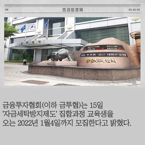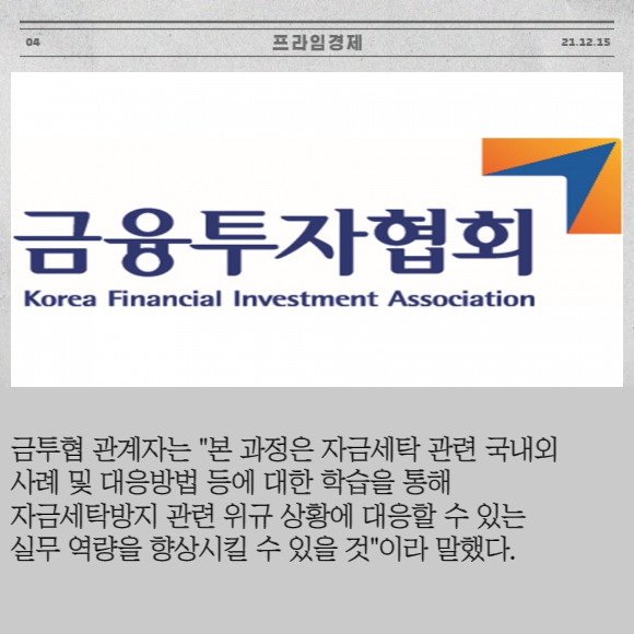 [프라임경제] 금융투자협회(이하 금투협)는 15일 '자금세탁방지제도' 집합과정 교육생을 오는 2022년 1월4일까지 모집한다고 밝혔다.