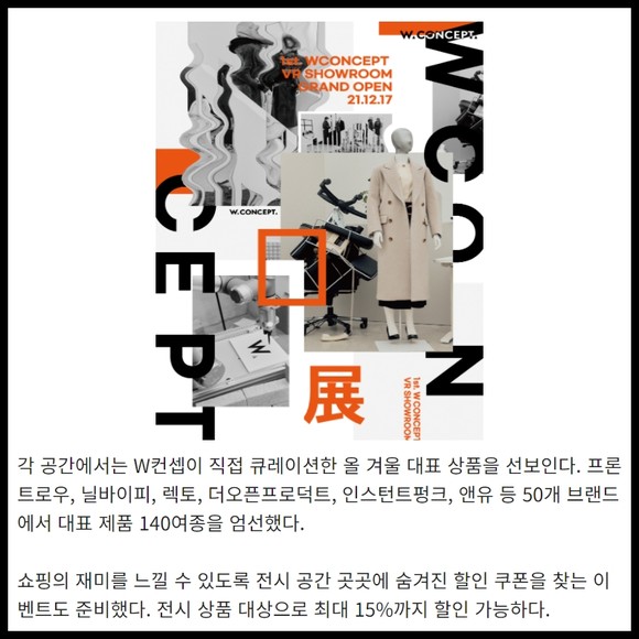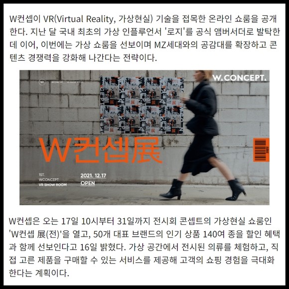 [프라임경제] W컨셉이 VR(Virtual Reality, 가상현실) 기술을 접목한 온라인 쇼룸을 공개한다. 지난 달 국내 최초의 가상 인플루언서 '로지'를 공식 앰버서더로 발탁한데 이어, 이번에는 가상 쇼룸을 선보이며 MZ세대와의 공감대를 확장하고 콘텐츠 경쟁력을 강화해 나간다는 전략이다.