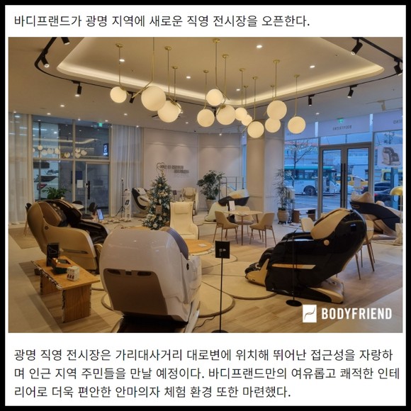 광명 직영 전시장은 가리대사거리 대로변에 위치해 뛰어난 접근성을 자랑하며 인근 지역 주민들을 만날 예정이다. 바디프랜드만의 여유롭고 쾌적한 인테리어로 더욱 편안한 안마의자 체험 환경 또한 마련했다.