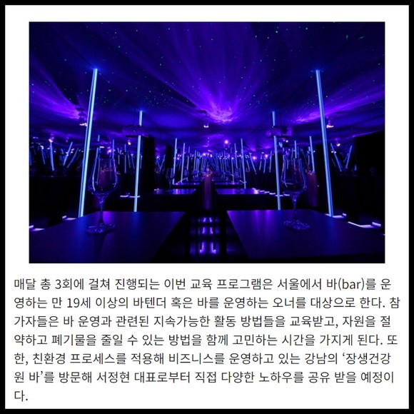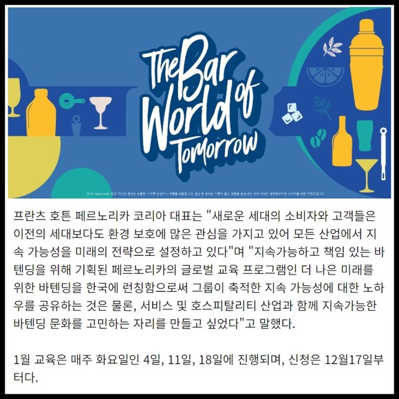 [프라임경제] 페르노리카 코리아(Pernod Ricard Korea)는 오는 1월부터 국내 바텐더와 바 오너를 대상으로 지속 가능한 친환경 바 문화를 구축하기 위해 '더 나은 미래를 위한 바텐딩(The Bar World of Tomorrow)' 전문 교육을 무료로 진행할 계획이다.