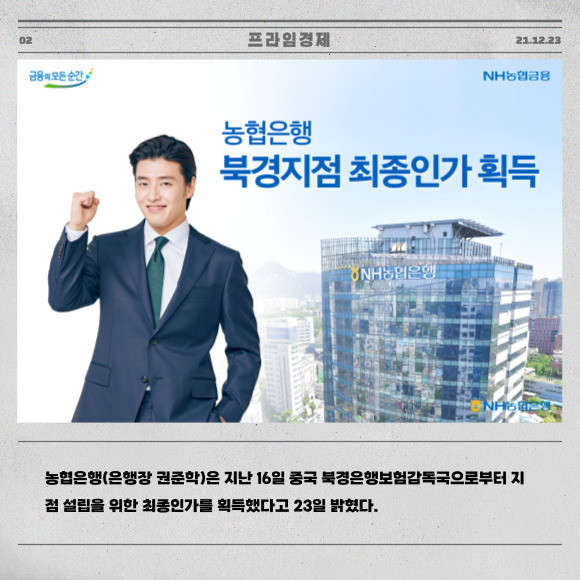 [프라임경제] 농협은행(은행장 권준학)은 지난 16일 중국 북경은행보험감독국으로부터 지점 설립을 위한 최종인가를 획득했다고 23일 밝혔다.