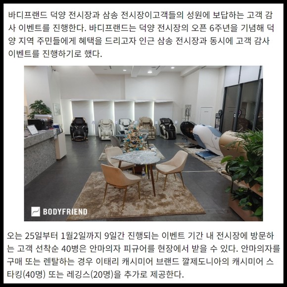 [프라임경제] 글로벌 안마의자 1위 바디프랜드 덕양 전시장과 삼송 전시장이고객들의 성원에 보답하는 고객 감사 이벤트를 진행한다. 바디프랜드는 덕양 전시장의 오픈 6주년을 기념해 덕양 지역 주민들에게 혜택을 드리고자 인근 삼송 전시장과 동시에 고객 감사 이벤트를 진행하기로 했다.