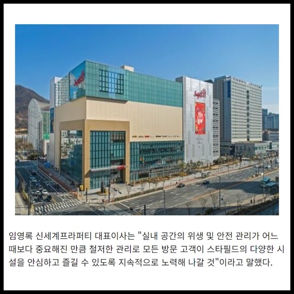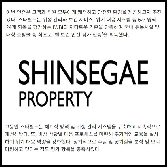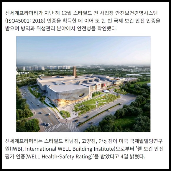 [프라임경제] 신세계프라퍼티가 지난 해 12월 스타필드 전 사업장 안전보건경영시스템(ISO45001: 2018) 인증을 획득한 데 이어 또 한 번 국제 보건 안전 인증을 받으며 방역과 위생관리 분야에서 안전성을 확인했다.