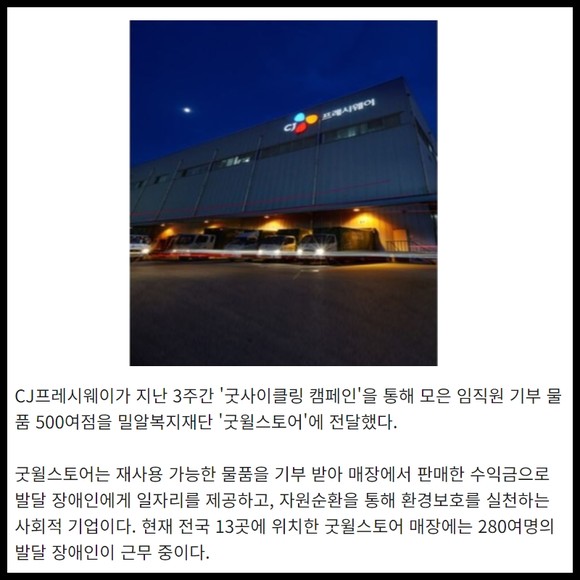 [프라임경제] CJ프레시웨이가 지난 3주간 '굿사이클링 캠페인'을 통해 모은 임직원 기부 물품 500여점을 밀알복지재단 '굿윌스토어'에 전달했다.