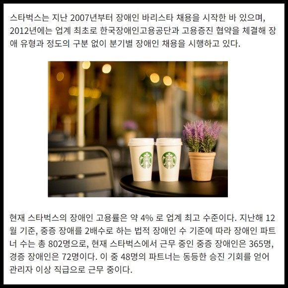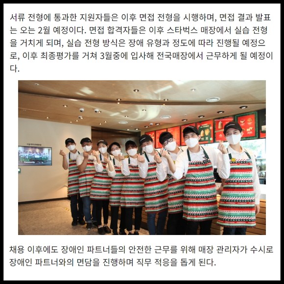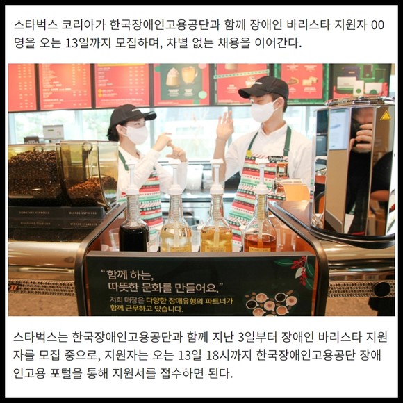 [프라임경제] 스타벅스 코리아가 한국장애인고용공단과 함께 장애인 바리스타 지원자 00명을 오는 13일까지 모집하며, 차별 없는 채용을 이어간다.