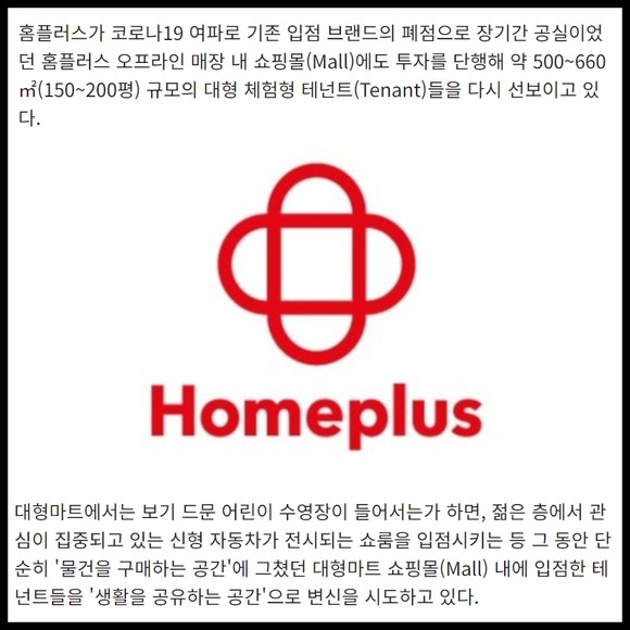 [프라임경제] 홈플러스가 코로나19 여파로 기존 입점 브랜드의 폐점으로 장기간 공실이었던 홈플러스 오프라인 매장 내 쇼핑몰(Mall)에도 투자를 단행해 약 500~660㎡(150~200평) 규모의 대형 체험형 테넌트(Tenant)들을 다시 선보이고 있다.