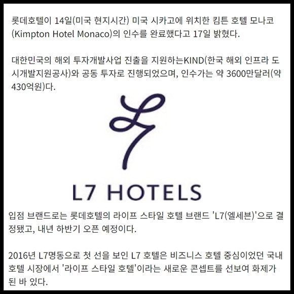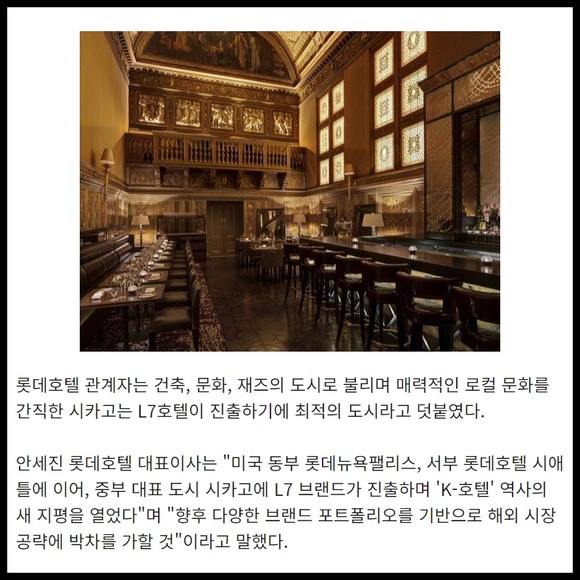 [카드] 롯데호텔, 美 시카고 킴튼 호텔 모나코 인수