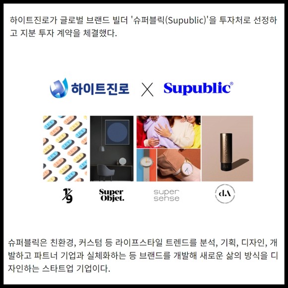 [프라임경제] 하이트진로가 글로벌 브랜드 빌더 '슈퍼블릭(Supublic)'을 투자처로 선정하고 지분 투자 계약을 체결했다.