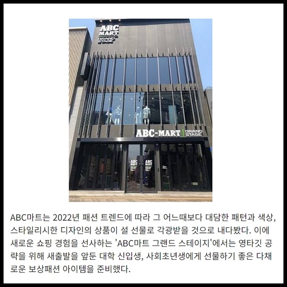 [프라임경제] ABC마트는 2022년 패션 트렌드에 따라 그 어느때보다 대담한 패턴과 색상, 스타일리시한 디자인의 상품이 설 선물로 각광받을 것으로 내다봤다. 이에 새로운 쇼핑 경험을 선사하는 'ABC마트 그랜드 스테이지'에서는 영타깃 공략을 위해 새출발을 앞둔 대학 신입생, 사회초년생에게 선물하기 좋은 다채로운 보상패션 아이템을 준비했다.