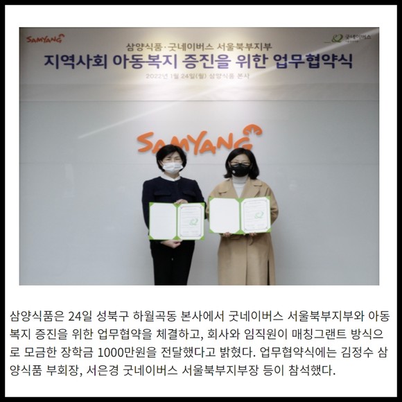 [프라임경제] 삼양식품은 24일 성북구 하월곡동 본사에서 굿네이버스 서울북부지부와 아동 복지 증진을 위한 업무협약을 체결하고, 회사와 임직원이 매칭그랜트 방식으로 모금한 장학금 1000만원을 전달했다고 밝혔다. 업무협약식에는 김정수 삼양식품 부회장, 서은경 굿네이버스 서울북부지부장 등이 참석했다.