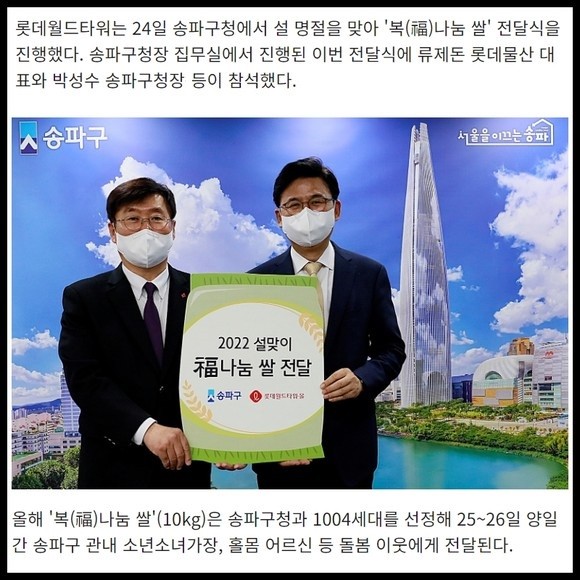 [프라임경제] 롯데월드타워는 24일 송파구청에서 설 명절을 맞아 '복(福)나눔 쌀' 전달식을 진행했다. 송파구청장 집무실에서 진행된 이번 전달식에 류제돈 롯데물산 대표와 박성수 송파구청장등이 참석했다.