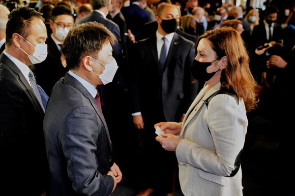 김동명 부사장이 발표 행사장에서 그레천 휘트머 미시간 주지사와 인사를 나누고 있다. ⓒ LG에너지솔루션