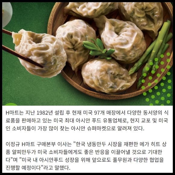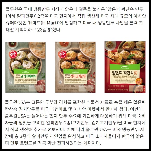 [프라임경제] 풀무원은 국내 냉동만두 시장에 얇은피 열풍을 불러온 '얇은피 꽉찬속 만두(이하 얄피만두)' 2종을 미국 현지에서 직접 생산해 미국 최대 규모의 아시안 슈퍼마켓인 'H마트(H Mart)'에 입점하고 미국 내 냉동만두 사업을 본격 확대할 계획이라고 28일 밝혔다.