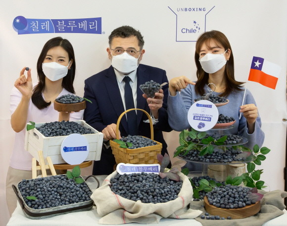 4일, 서울 중구 봉래동에 위치한 서울역점에서 호세 미겔 세뿔베다 또레스(Jose Miguel Sepulveda Torres) 주한칠레대사관 상무관(가운데)과 모델들이 상품을 홍보하고 있는 모습. © 롯데마트