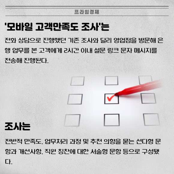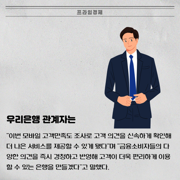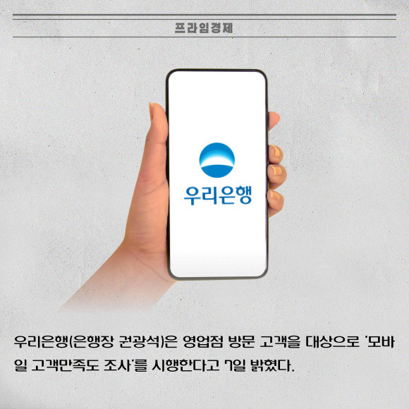 [프라임경제] 우리은행(은행장 권광석)은 영업점 방문 고객을 대상으로 '모바일 고객만족도 조사'를 시행한다고 7일 밝혔다.