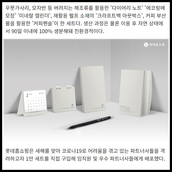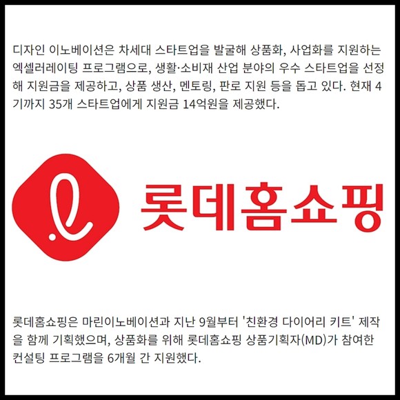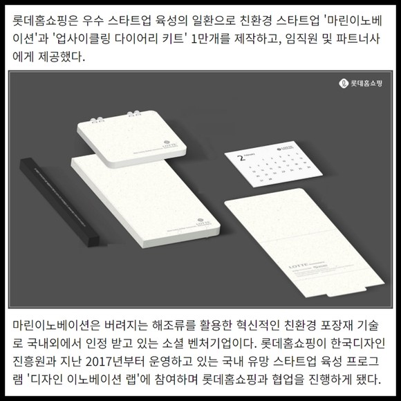 [프라임경제] 롯데홈쇼핑은 우수 스타트업 육성의 일환으로 친환경 스타트업 '마린이노베이션'과 '업사이클링 다이어리 키트' 1만개를 제작하고, 임직원 및 파트너사에게 제공했다.