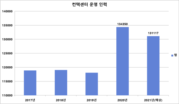 컨택센터 운영기업 인력은 2020년 처음으로 13만명을 돌파한 데 이어 2021년에도 13만명 이상을 유지했다. ⓒ 프라임경제
