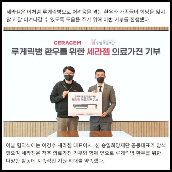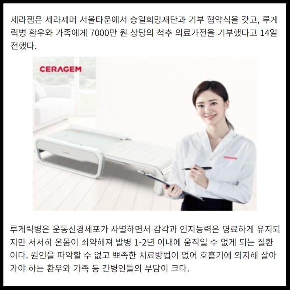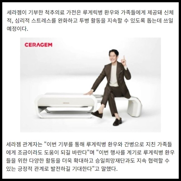 [프라임경제] 세라젬은 세라제머 서울타운에서 승일희망재단과 기부 협약식을 갖고, 루게릭병 환우와 가족에게 7000만 원 상당의 척추 의료가전을 기부했다고 14일 전했다.