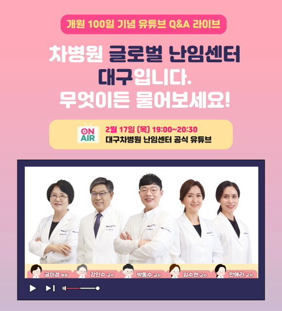 차 의과학대학교 대구차병원 난임센터가 오는 17일 오후 7시 개원 100일을 맞아 유튜브 라이브 생방송 '차병원 글로벌 난임센터 대구입니다. 무엇이든 물어보세요'를 방송한다.