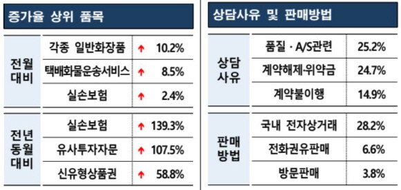 상담사유별로는 '품질·AS관련'이 1만1234건(25.2%), 계약해지·위약금 1만971건(24.7%), 계약불이행 6634건(14.9%) 순이었으며, 일반판매를 제외한 판매방법에서는 '국내 전자상거래' 1만2537건(28.2%), 전화권유판매 2936건(6.6%), 방문판매 1713건(3.8%) 순으로 비중이 높았다.