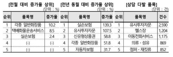 전년 동월 대비 상담 증가율은 △실손보험(139.3%) △유사투자자문(107.5%) △신유형상품권(58.8%) 순으로 높게 나타났다. '유사투자자문'은 서비스 불만족으로 계약해지를 요구했으나 업체에서 거부해 불만을 제기한 사례가 많았으며, 신유형상품권은 포인트 구입 후 환불을 요청했으나 사업자와의 연락이 두절된 경우 등이 늘었다.