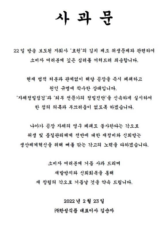 김순자 한성식품 대표이사는 23일 사과문을 통해 "김치 제조 위생문제와 관련해 소비자 여러분께 깊은 심려를 끼쳐드려 죄송하다"고 밝혔다.