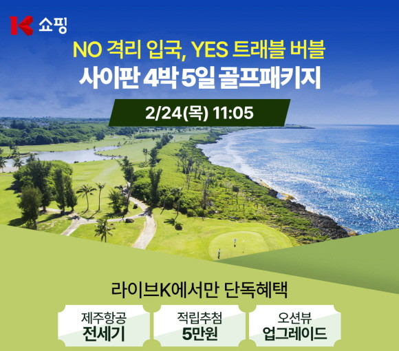 오는 24일 오전 11시5분 K쇼핑 모바일앱에서 진행되는 라이브커머스에서는 '3월 사이판 4박5일 72홀 골프패키지' 상품이 방송된다. 사이판의 대표 프리미엄 숙소인 '코럴 오션 리조트' 숙소(2인 1실) 및 조식, 그린피(72홀), 전동카트(2인 1카트), 여행자보험, 공항 미팅 및 샌딩 서비스가 포함됐으며, 제주항공 전세기를 통해 안심하고 편안한 여행을 다녀올 수 있다.