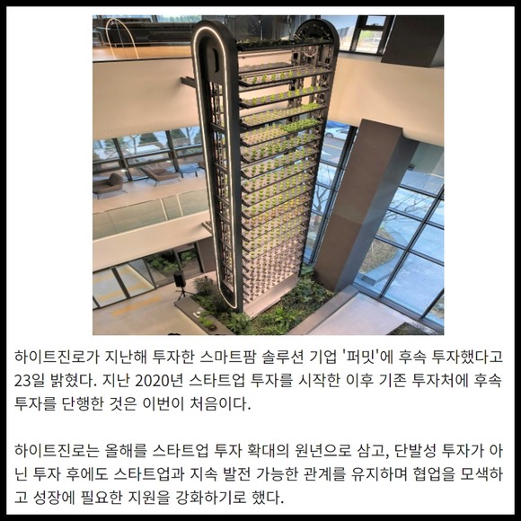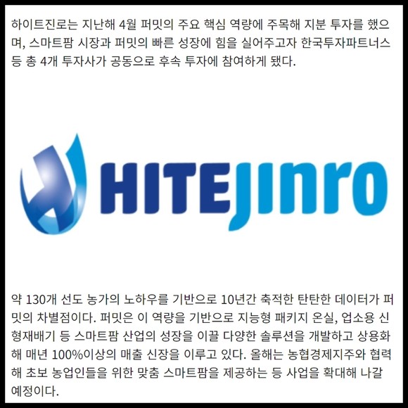 [프라임경제] 하이트진로(대표 김인규)가 지난해 투자한 스마트팜 솔루션 기업 '퍼밋'에 후속 투자했다고 23일 밝혔다. 지난 2020년 스타트업 투자를 시작한 이후 기존 투자처에 후속 투자를 단행한 것은 이번이 처음이다.