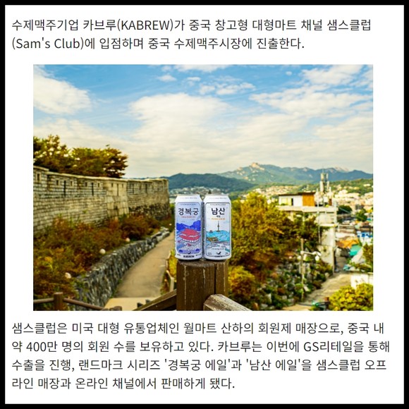 [프라임경제] 수제맥주기업 카브루(KABREW)가 중국 창고형 대형마트 채널 샘스클럽(Sam's Club)에 입점하며 중국 수제맥주시장에 진출한다.