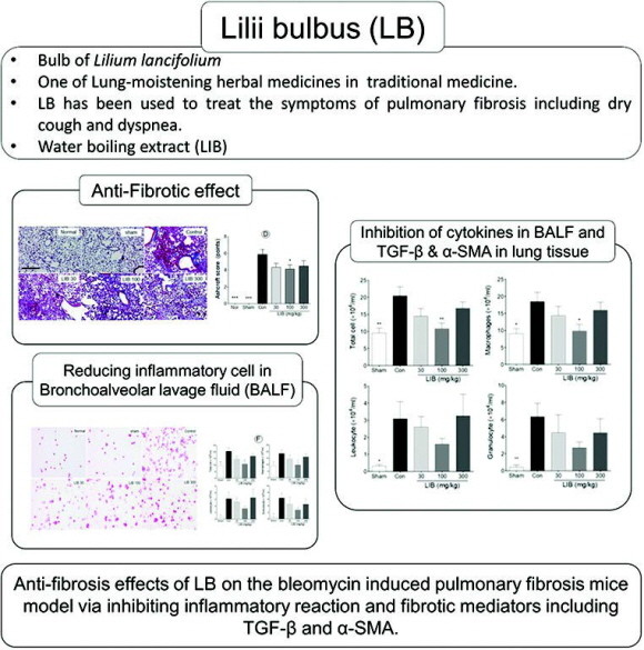 이번 연구는 폐섬유화를 유도한 실험쥐에 백합 30mg, 100mg, 300mg을 하루 2회 10일간 투여해 폐섬유화와 관련된 체중, 폐조직의 변화, 기관지세척액의 염증지표, 폐조직에서의 폐섬유화 관련 인자인 TGF-beta, alpha-SMA, 염증관련 cytokine 등 여러 지표들을 정상군 및 대조군과 비교해 관찰했다. 그 결과, 백합 100mg 투여군에서 가장 효과가 좋게 나타났다.